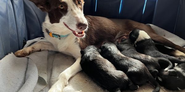 The 2022 Chaser-Flora Litter was born on 4/11/22 starting at 5:00pm with the arrival of a beautiful Black and White little girl. The next three pups were all Black and white females and one smaller Black Tri-colored female before a handsome Black and white little boy popped out at 7:30 followed by another boy, this one Red and White at 8:03. All are healthy and active! Within four weeks all the pups were promised.